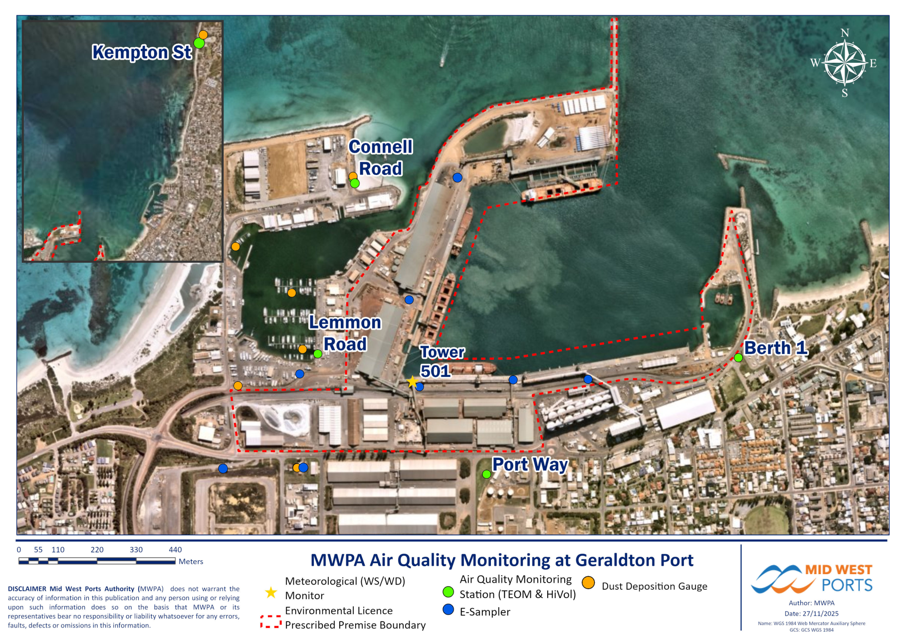 To supplement this, eight E-Samplers are positioned near key operational areas. These measure PM10 levels at 5-minute intervals to help identify potential dust sources of dust before it travels beyond the Port boundary.